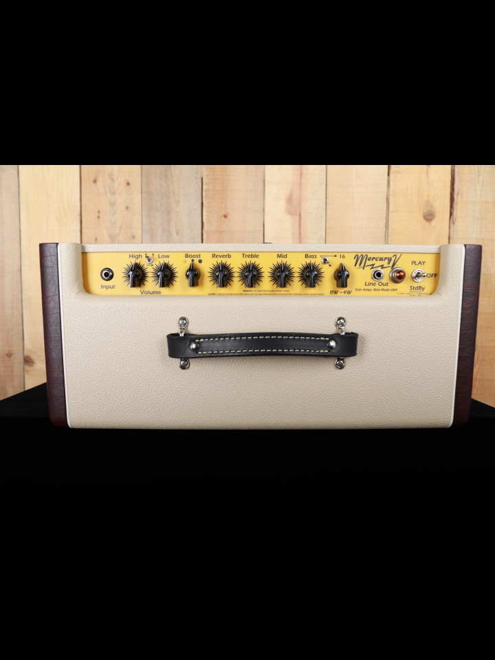 Based on a pair of 6V6GT power tubes for a full-throated 16 watts, the Mercury V harnesses an ingeniously original preamp circuit featuring dual Volume controls (for High and Low voicings), a three-position Boost switch, and a three-knob EQ stage to kick out a dynamic range of distinctly English tones. The results included everything from pushed ’60s cleans, to chunky ’70s rock, right into’80s and ’90s crunch and singing leads, and even scorching high-gain sizzle. The internally paired High and Low channels can be run in parallel like a jumpered four-hole classic, or switched to cascade in series, taking the gain levels off the charts and into the 21st century.