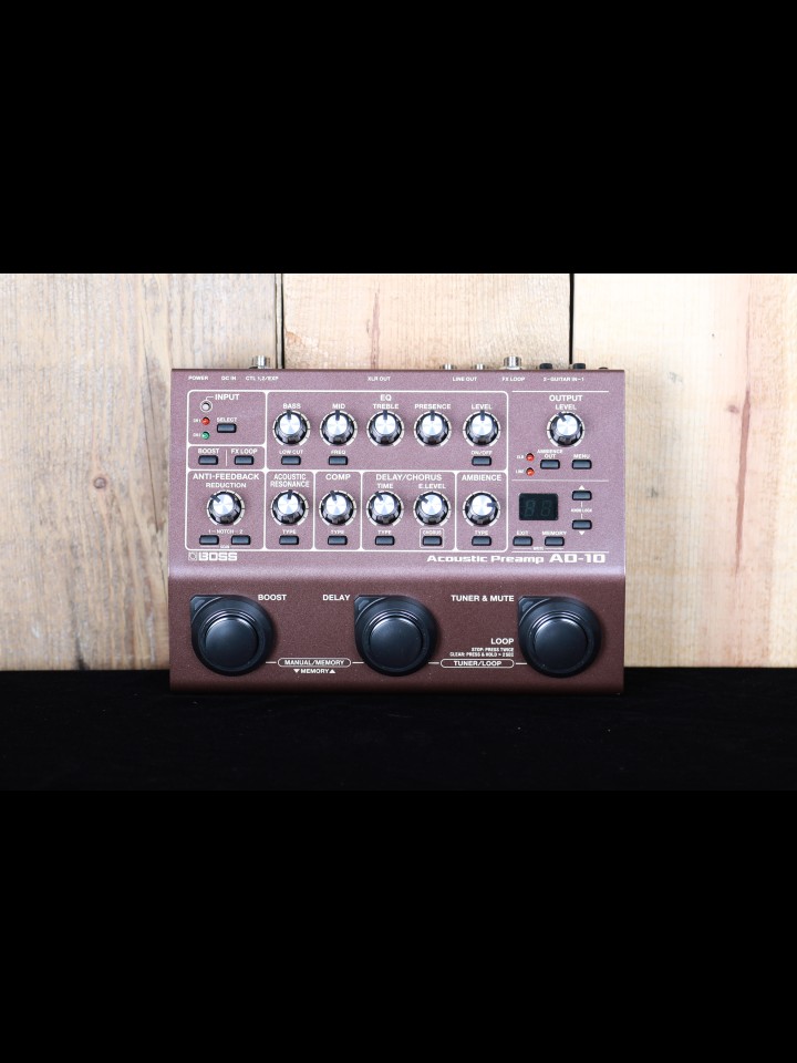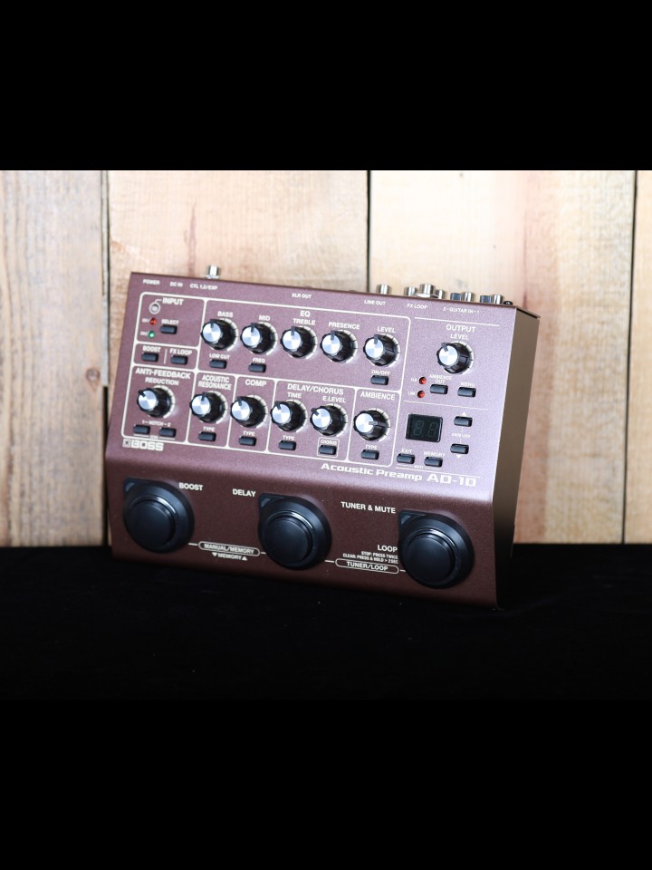 The AD-10 takes acoustic preamp design to an all-new level with its standout feature—BOSS’s groundbreaking Acoustic Resonance processing. This advanced tech restores the complex body and string resonances that are lost with most pickup systems, bringing back the expressive, organic vibe that’s so vital to the acoustic experience. And the features keep on coming, with transparent anti-feedback controls, memories for sound setups, an 80-second looper, USB audio, and much more. Hugely powerful yet simple to use, the compact AD-10 is your all-in-one companion for realizing impressive acoustic tones in every performing environment.”-from the Boss website