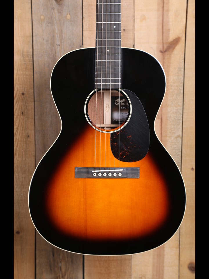 "Reminiscent of models from the “Golden Era”, the CEO-7 features a sunburst finish, golden age tuners and authentic headplate lettering. This new 14-fret short scale 00 “sloped shoulder” model features a solid Adirondack spruce top with solid genuine mahogany back and sides for complex tonality." - From the Martin website
