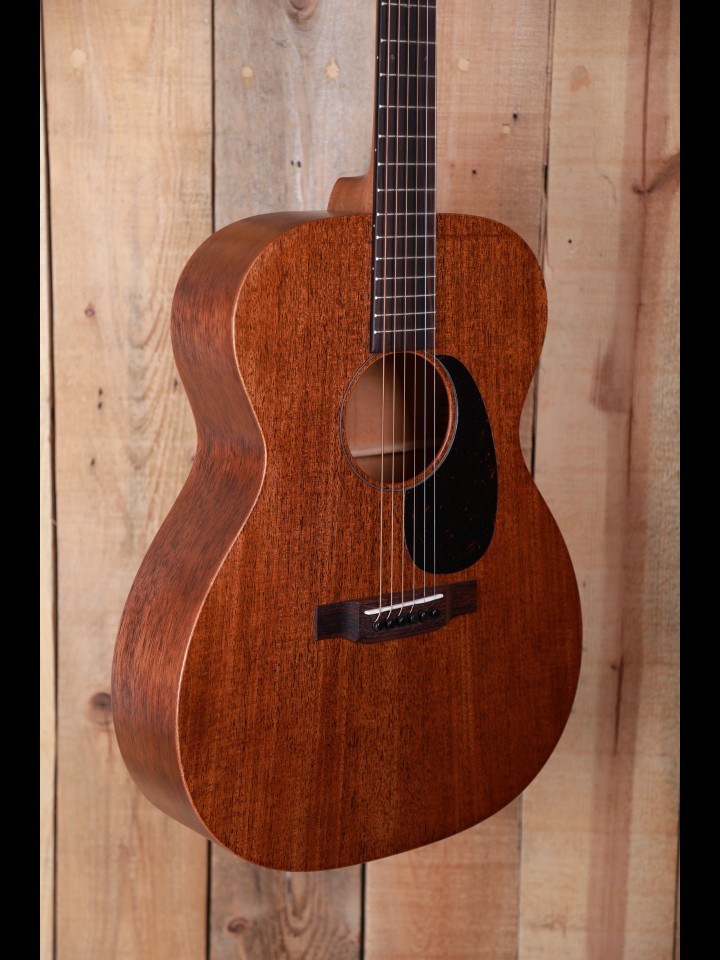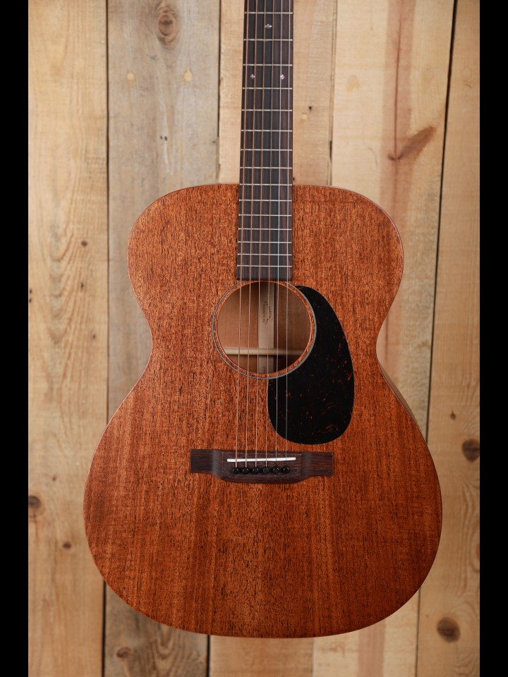 From our perspective, when Martin revamped the 15 Series of guitars a few years ago they hit a home run - they converted good and interesting guitars into fine and exciting instruments. The makeover was both functional and cosmetic. Now, the top, back and side are made with genuine mahogany rather than Sapele which is sometimes called African mahogany, and the neck is also made with genuine mahogany rather than a 'select hardwood'. Bone, not Corian, is used for both the nut and the custom compensated saddle, and the bridge pins are ebony rather than plastic. The fingerboard is now tastefully ornamented with diamond and square inlays instead of dots, and the top is dressed with a high quality Delmar tortoise colored pickguard. And finally, with a look from the past, the nickel tuning machines are vintage style with open gears and butterbean knobs.
