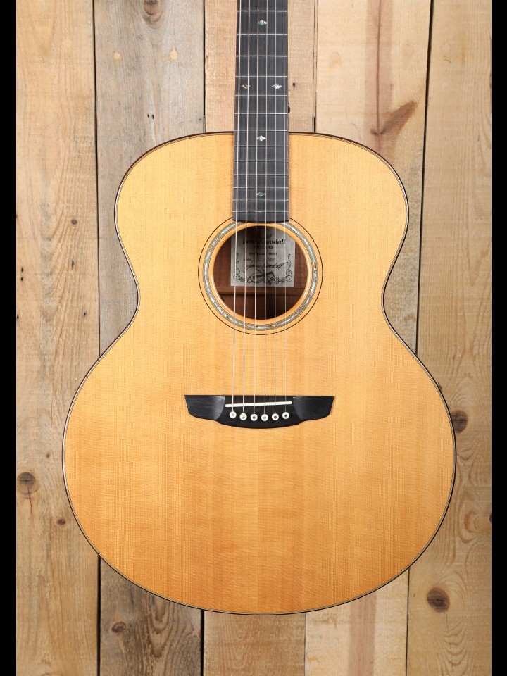 When we special ordered this guitar years ago, it was designed to be a big guitar for a big man (but a very sweet big man, who will be missed!). It was his dream guitar; and, when it arrived, it was clear that James Goodall had hit the mark like Robin Hood, as the dream was now a reality. This Goodall Koa Jumbo comes just about as close as one can to being a piano squeezed into a guitar-sized box, albeit a very large guitar-sized box as guitar-sized boxes go. As a super jumbo, this KJ has tremendous breath of tone and power, which create a commanding presence so three dimensional that it inspires one to climb inside the guitar and listen to the notes bounce around with cavernous echo. Indeed, in such a space, it seems one can get lost for days in the ringing sustain before they realized they were out of food and water and needed to find their way out of the cave back to loved ones and, perhaps, a job. Thanks to Goodall’s inherently bright voicing, the guitar has a beautiful shimmering treble and remains surprisingly balanced, while retaining a good deal of clarity in the mid-range. Whether used for strumming or fingerstyle applications, the player is at the helm of an extremely dynamic and spacious voice.