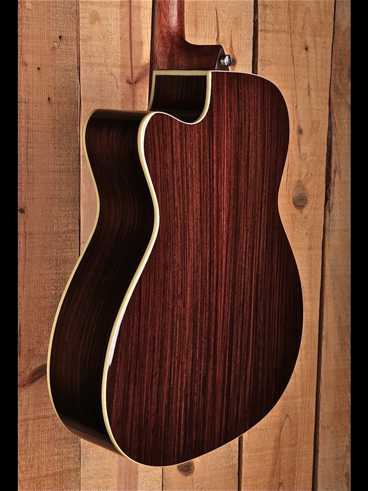 Tonally we have balanced the compression available from the smaller body size with a lighter weight X-brace design. This keeps the OM’s round notes and super-fast response but balances those features with a more open projection. No matter what music or playing style you gravitate to, this all-solid, finely dressed guitar is a true all-rounder with an impressive, eloquent voicing.