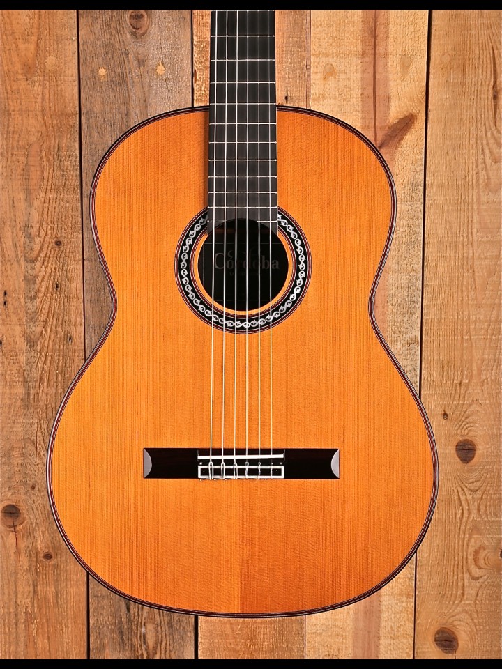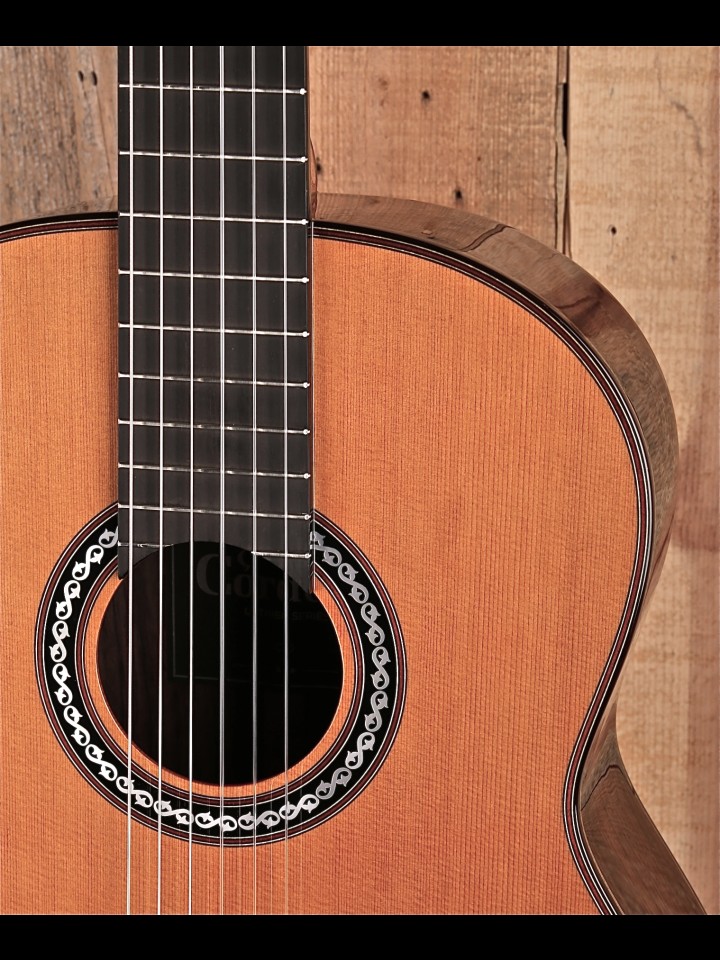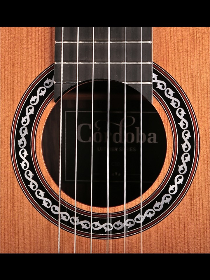 Delicate aesthetic touches like its 1920s-inspired pearloid rosette add a touch of vintage elegance. Other stand-out features such as a rosewood fingerboard and bridge, red purfling, high gloss finish, and Savarez Cristal Corum strings makes this a Córdoba best-seller and a guitar you’ll play for a lifetime." - From the Cordoba website