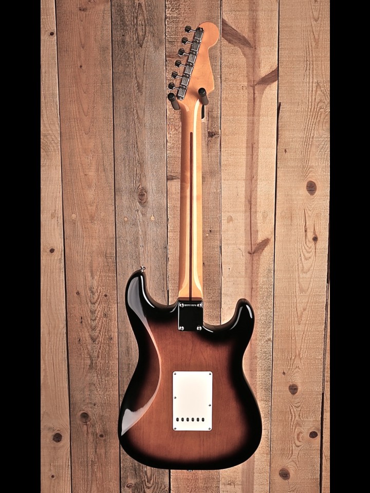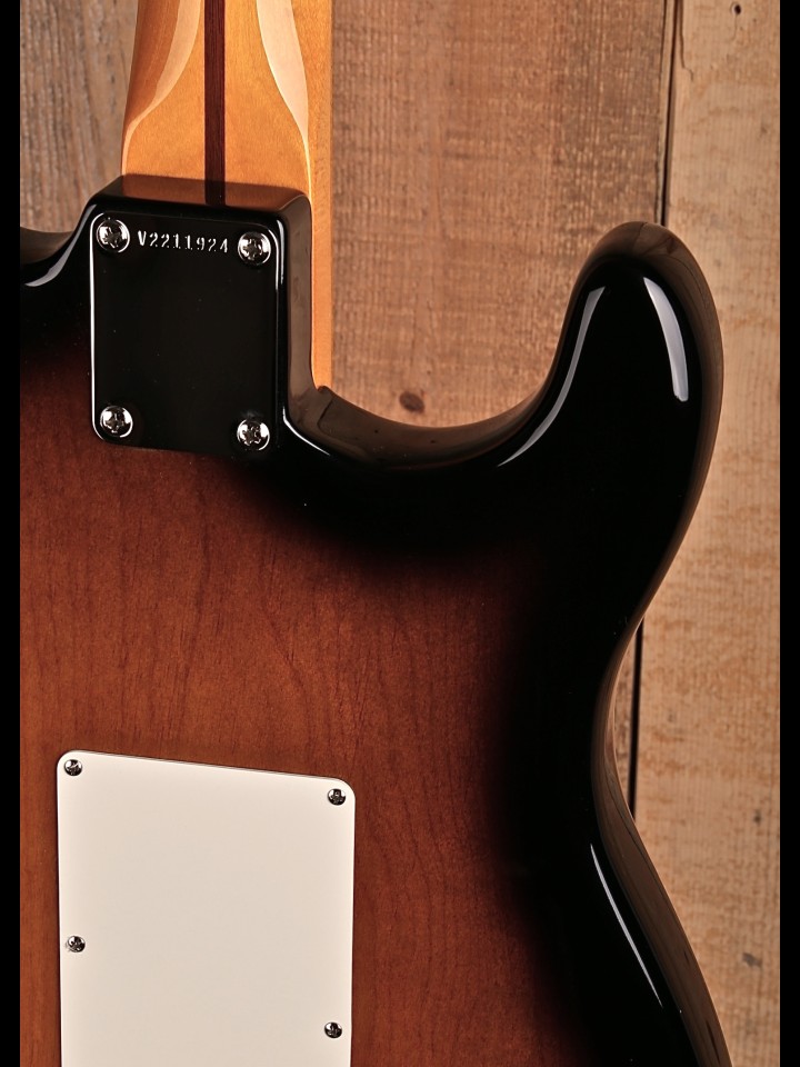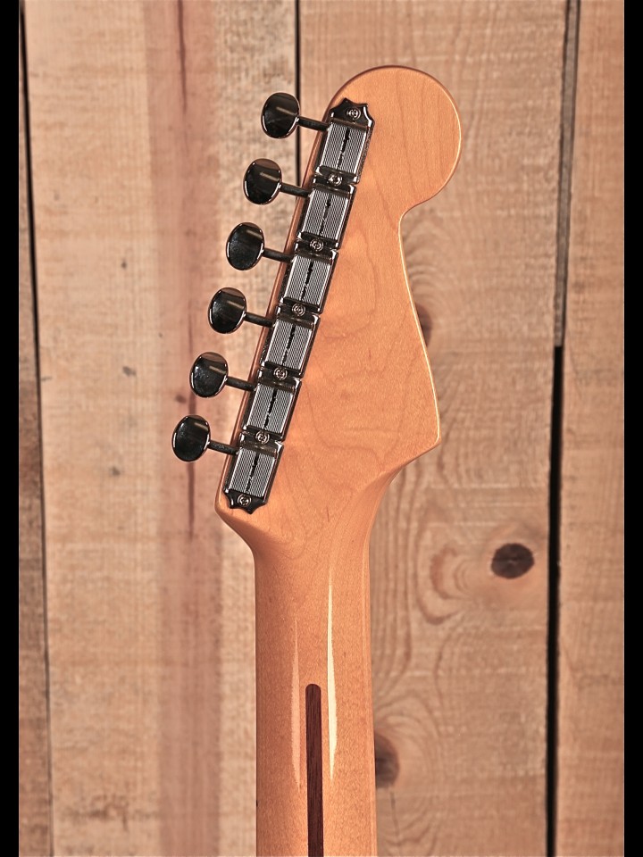 Featuring a trio of Pure Vintage '57 Stratocaster pickups, sweeping body contours and a supremely comfortable "V"-shape neck with a 7.25" radius maple fingerboard, the American Vintage II 1957 Stratocaster reproduces the quintessential tone and feel of the original. Other appointments include a vintage-accurate synchronized tremolo with cold rolled steel block and bent steel saddles, single-line "Fender Deluxe" tuners and a single-ply pickguard…” – From the Fender Website