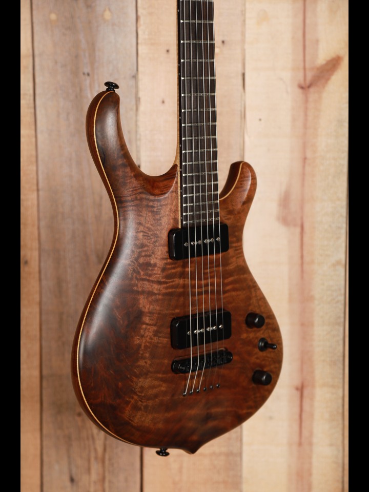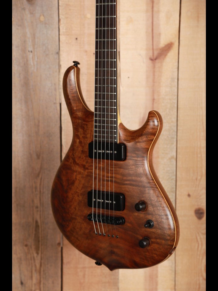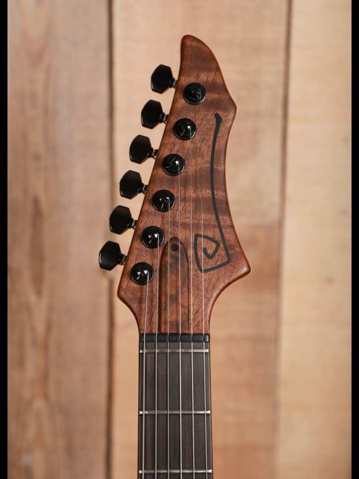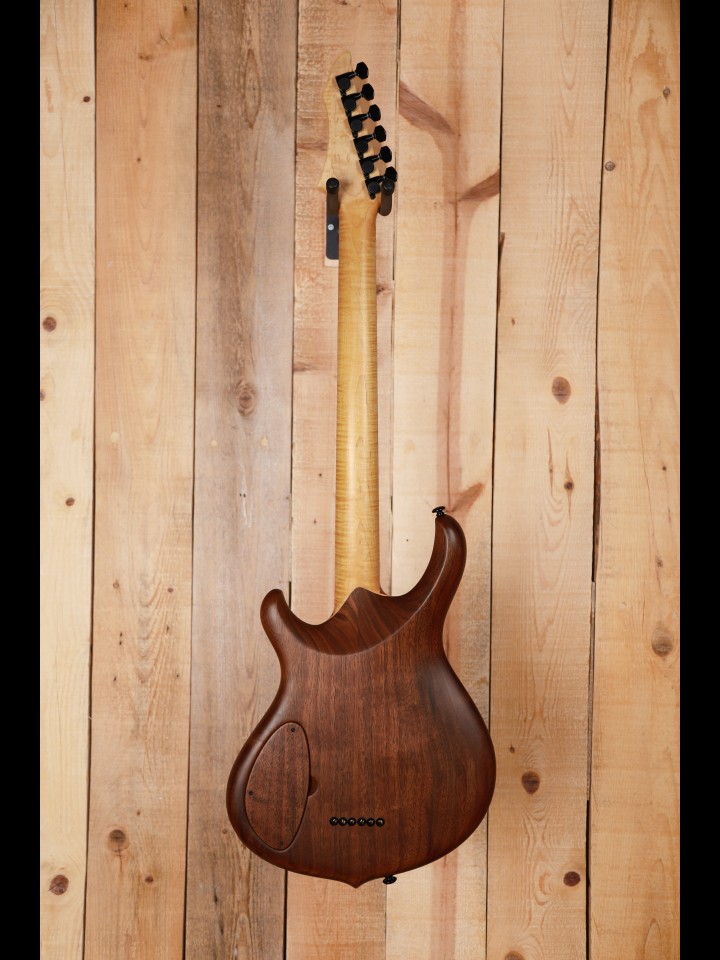Along the lines of the remarks above, the builder of this guitar, William Jeffrey Jones, does not have much of a presence in the guitar market. Evidently, he is multi-disciplined artist with interests in ceramics, sculpture, woodworking, and music. Needless to say, his enthusiasm for woodworking and sculpture are readily on display with regard to his guitars, many of which feature elaborate relief carvings, in addition to a general theme of unique wooden components (e.g., cover plates and pickup covers). Though this iO Longhorn model does not feature any relief carving, there is certainly a very considered approach to its sculpted body design that is at once familiar but novel (a tricky thing to achieve in art!). For example, the slightly oblong double horn body channels elements of both Alembic and PRS, but the sight lines of the body contours, the headstock shape, and the set flamed maple neck joint are more dramatic. Regardless of the inspiration, these design elements culminate in a truly elegant visual and, more importantly, physical balance. Meanwhile, the Danish oil and Tru-oil finishing approach seen on this guitar is more consistent with that of furniture makers and wood turners. One could argue that hand-rubbed oil finishes of this nature yield the ultimate satin finish, both in terms of feel and texture. The oil finish creates warm, shimmery visual depth that allows the hue and grain of the woods to pop without being garish. All of these features, including the wood choices themselves, reflect the sensibilities of a craftsman who has profound respect for nature and who greatly values the materials he utilizes.