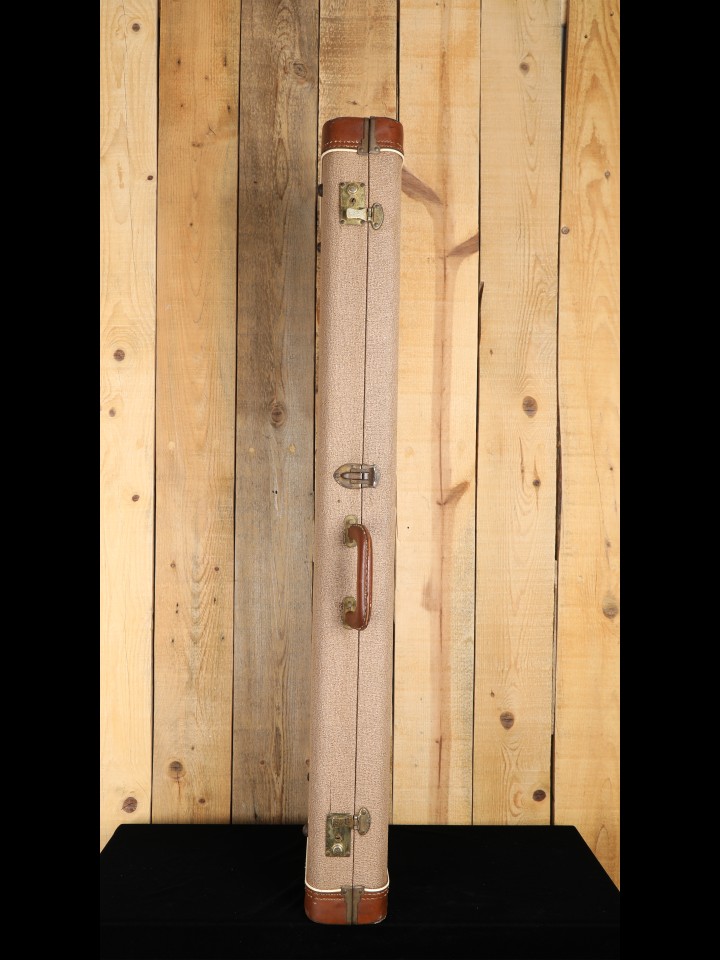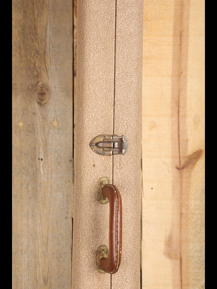 This iconic rectangular coco early ‘60s Fender case is a survivor with some wear and tear to show for its many years of us, but it remains quite functional. This case was part of a fair-sized estate of approximately forty dusty, musty, moldy guitars that we purchased in the fall of 2025. During our initial evaluation of the lot, we immediately noticed the unmistakable Coco color of this case peeking out from a pile of random cases. Upon opening the case, we were greeted by the site of what appeared to be an extremely clean Fiesta Red slab-board Strat—pulses quickened. Sadly, upon dismantling the guitar, it was clear that it was but a very deceptive Allparts guitar masquerading as a ‘60s Strat that happened to be housed in an original ‘60s case for an offset model—hearts sank. Disappointed as we were with the inauthentic guitar, finding an early Fender case in the mix was a satisfying silver lining. (Incidentally, the parts Strat that was housed in the case has since been stripped of its undeserved waterslide logo and properly listed separately for what it really is.) Now, having benefitted from some cleaning and a few repairs (please see condition notes below), this lonely offset case is ready to be reunited with a genuine Jazzmaster or Jaguar of the era.