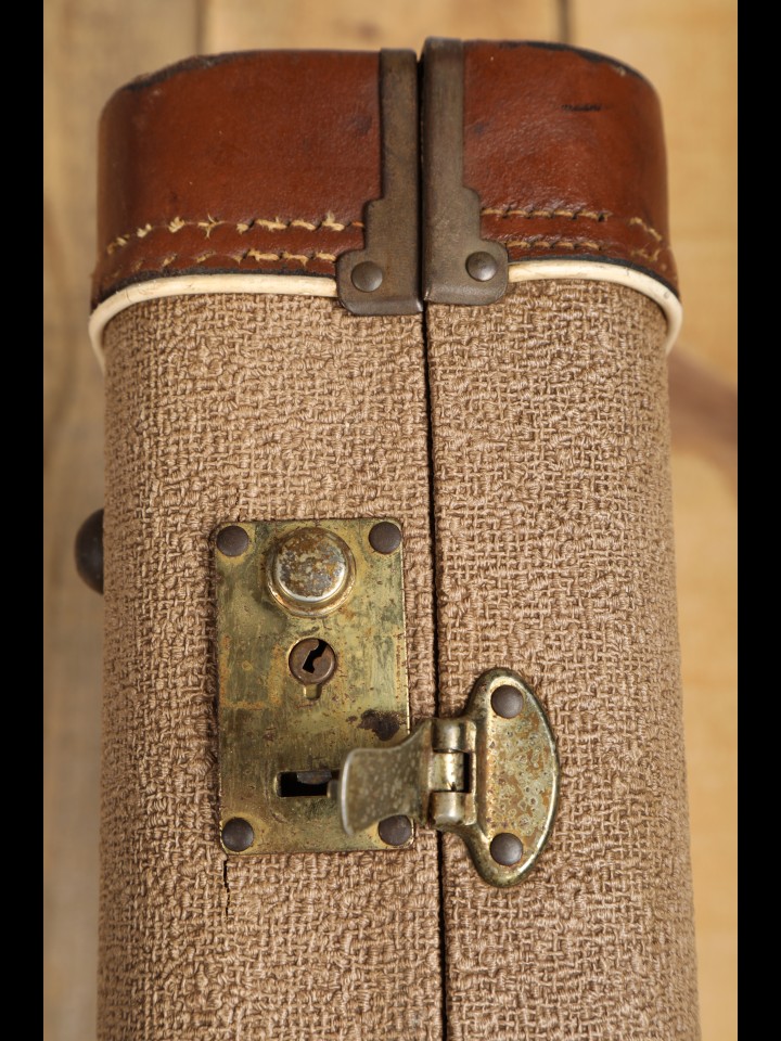Finally, while all functional, several hardware components have some wear of note. Corresponding to the distorted section of the case mentioned above, the rear center latch is missing its top rivet. As also mentioned above, the top section of the front clasp has been remounted with two new brass brads. Finally, the two locking latches have both lost the springy bounce in their step (i.e., they don’t pop up when their latch is pulled to the side). Though the latch functions and clasps securely, it appears that the barrel section of the hinge on the latch closest to the headstock area is cracked, thereby allowing the top section to slightly pivot/tilt laterally when not latched. There is some similar wiggle in the other latch (body section), but to a much lesser degree. With that said, both latches both would benefit from a little bit of additional service (perhaps from a luggage repair company) to be restored to proper springy action. FAIR condition.